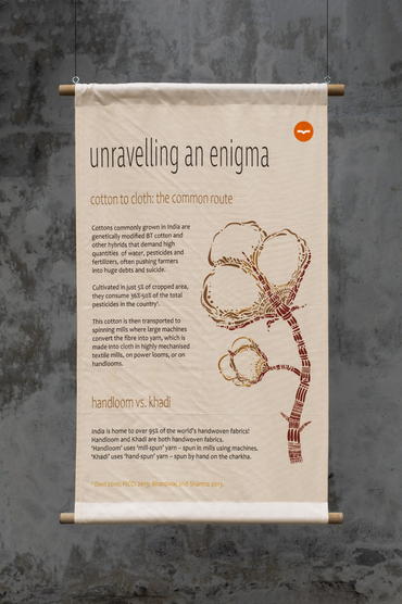 The process was rich with learning and discovery; I learnt a great deal about spinning, handloom, cotton textiles and distribution through the reading material Samyuktha, the project lead, shared with me. Upon understanding the project scope, I put together a deck with four moodboard options to guide the visual style of our posters. After reviewing the initial copy, we also discussed how the information could be worked into a series of posters in a concise and engaging manner. I collated a few ideas for how the posters could be mounted for display.